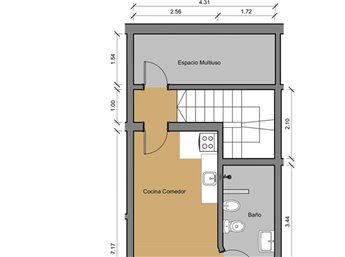Monoambiente en primer piso por escalera con estar, cocina integrada, dos espacios multiusos (uno en planta baja con entrada propia y otro dentro del apartamento) que pueden ser utilizados como dormitorios, escritorios o lugares de guardado y baño. Calefacción por Aire acondicionado Split.