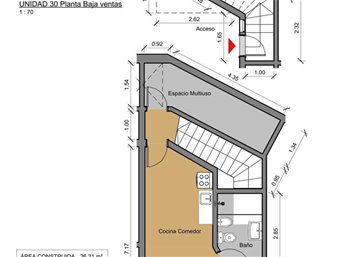 Monoambiente en primer piso por escalera con estar, cocina integrada, dos espacios multiusos (uno en planta baja con entrada propia y otro dentro del apartamento) que pueden ser utilizados como dormitorios, escritorios o lugares de guardado y baño. Calefacción por Aire acondicionado Split.